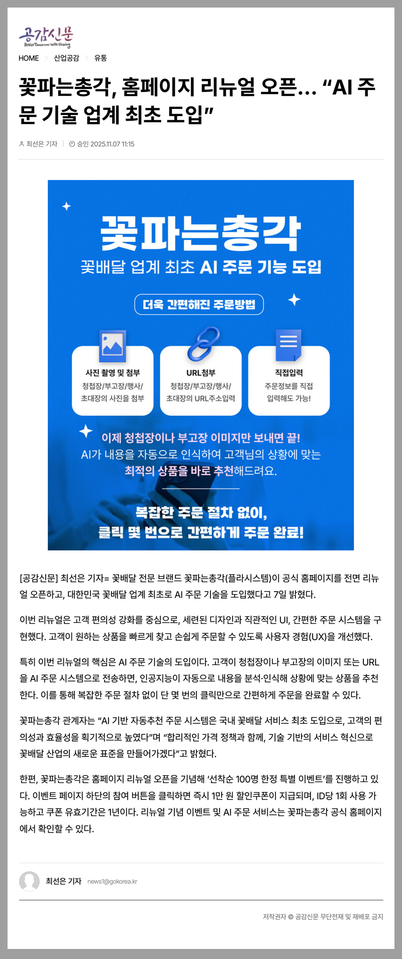 | Á¦¸ñ | ²ÉÆÄ´ÂÃѰ¢ AIÁÖ¹® ±â¼ú ¾÷°è ÃÖÃÊ µµÀÔ |